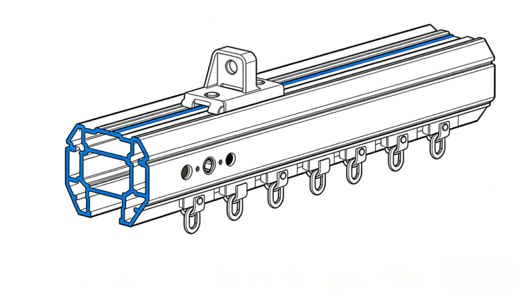A commercial curtain track system is a mechanical rail system designed to support, guide, and operate curtains or drapery in high-traffic environments. Unlike residential systems, commercial tracks are engineered for: